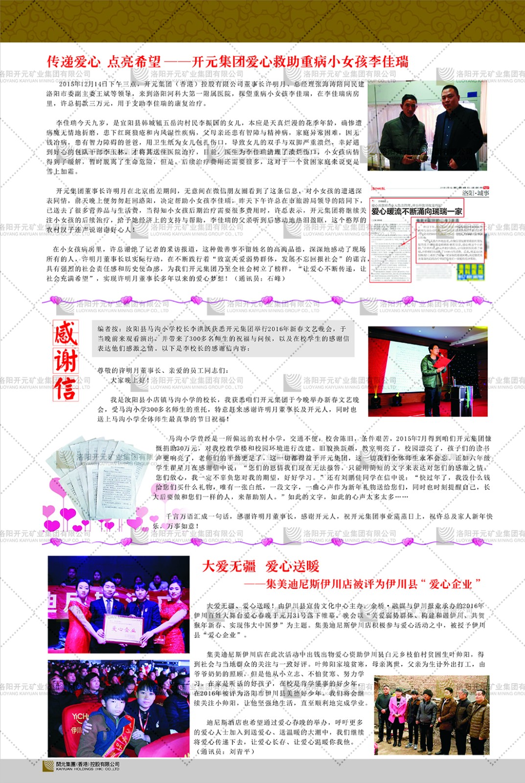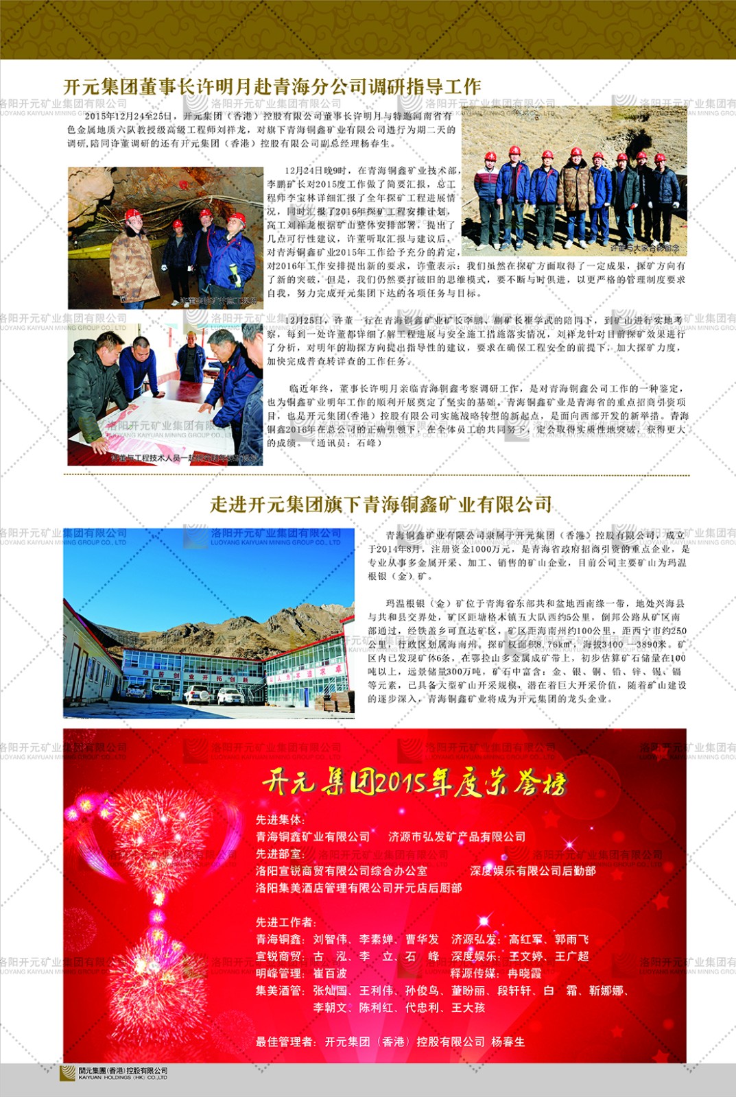 洛陽開元礦業(yè)集團有限公司簡介洛陽開元礦業(yè)集團有限公司,始成立于2006年,位于洛陽市開元大道269號。集團旗下共有十余家全資子公司,業(yè)務涉及有色金屬礦山開發(fā)、礦產品購銷與進出口貿易、房地產開發(fā)、文化藝術、企業(yè)管理與咨詢、資本投資等多個領域。2024年,集團公司銷售總額達7.8億元。民建河南省委委員、民建河南省委企業(yè)委副主任、民建洛陽市委委員、企業(yè)委主任、洛陽民建企業(yè)家協(xié)會會長許明月是公司創(chuàng)始人,現(xiàn)任洛陽開元礦業(yè)集團有限公司董事長。在礦業(yè)領域,洛陽開元礦業(yè)集團擁有多家實力雄厚的子公司:貴州開元礦業(yè)有限公司探、采礦權面積共11.33平方公里;興海縣銅鑫礦業(yè)有限公司探礦權面積8.76平方公里,礦山資源潛力巨大;2021年,開元集團與盧氏中科礦業(yè)有限公司開展戰(zhàn)略合作。盧氏中科礦業(yè)有限公司專注于有色金屬的浮選、加工和銷售,擁有強大的技術支撐平臺,是集探、采、選、冶、研為一體的中大型綜合礦業(yè)企業(yè)。目前,盧氏中科王家河1000噸選礦廠已成功投產,雙河金礦、柳關欒盧鉛鋅礦相繼順利開工,樓房銀礦與圪老灣鉛鋅礦的深部探礦重大突破,標志著礦山版圖取得重大進展,為開元集團后續(xù)發(fā)展奠定了堅實基礎。在文化傳媒領域,洛陽市明月美術館通過豐富多樣的藝術展覽、學術研討和公共教育活動,努力打造一個集展覽、交流、教育、研究為一體的綜合性藝術平臺。此外,在金融投資領域,開元集團旗下的北京明峰資本管理有限公司專注于投資具有高增長潛力的優(yōu)秀企業(yè),特別是高科技、新能源、環(huán)保等新興產業(yè),為客戶提供個性化的資產配置服務。在做好企業(yè)經營的同時,開元集團始終不忘企業(yè)的社會責任和家國情懷,以突出的愛心公益事跡,開展了一系列公益慈善活動:“民建林”公益事業(yè)通過“思源基金”“幫幫公益”線上公益平臺,與眾多愛心人士籌措資金20余萬元;資助541名貧困大學生共計270余萬元,推進“數(shù)字助力——河南AI人才培養(yǎng)”;捐款10萬元,馳援京津冀、黑龍江洪水地質災害……公司于2017年底被洛陽市慈善總會評為“洛陽慈善風云榜——十大愛心集體”。洛陽開元礦業(yè)集團有限公司秉承持續(xù)發(fā)展理念,憑借多年來良好的企業(yè)信譽與經營業(yè)績,與全國多家企業(yè)建立了良好合作關系,受到社會各界的一致好評,多次榮獲“納稅標兵”“先進企業(yè)”“招商引資模范企業(yè)”等榮譽稱號?;赝麃頃r路,開元人勠力同心,以“闖”的精神和“創(chuàng)”的勁頭,一路披荊斬棘,踏過千山萬水;展望新未來,開元人凝心聚力,不執(zhí)于“舊”,無畏于“新”,秉承“勇于跨越,追求卓越”的企業(yè)精神,乘著國家高質量發(fā)展新征程的東風,跨過高山,越過大海,向著集團多元化、國際化的目標,逐夢遠航,跨越前行!
