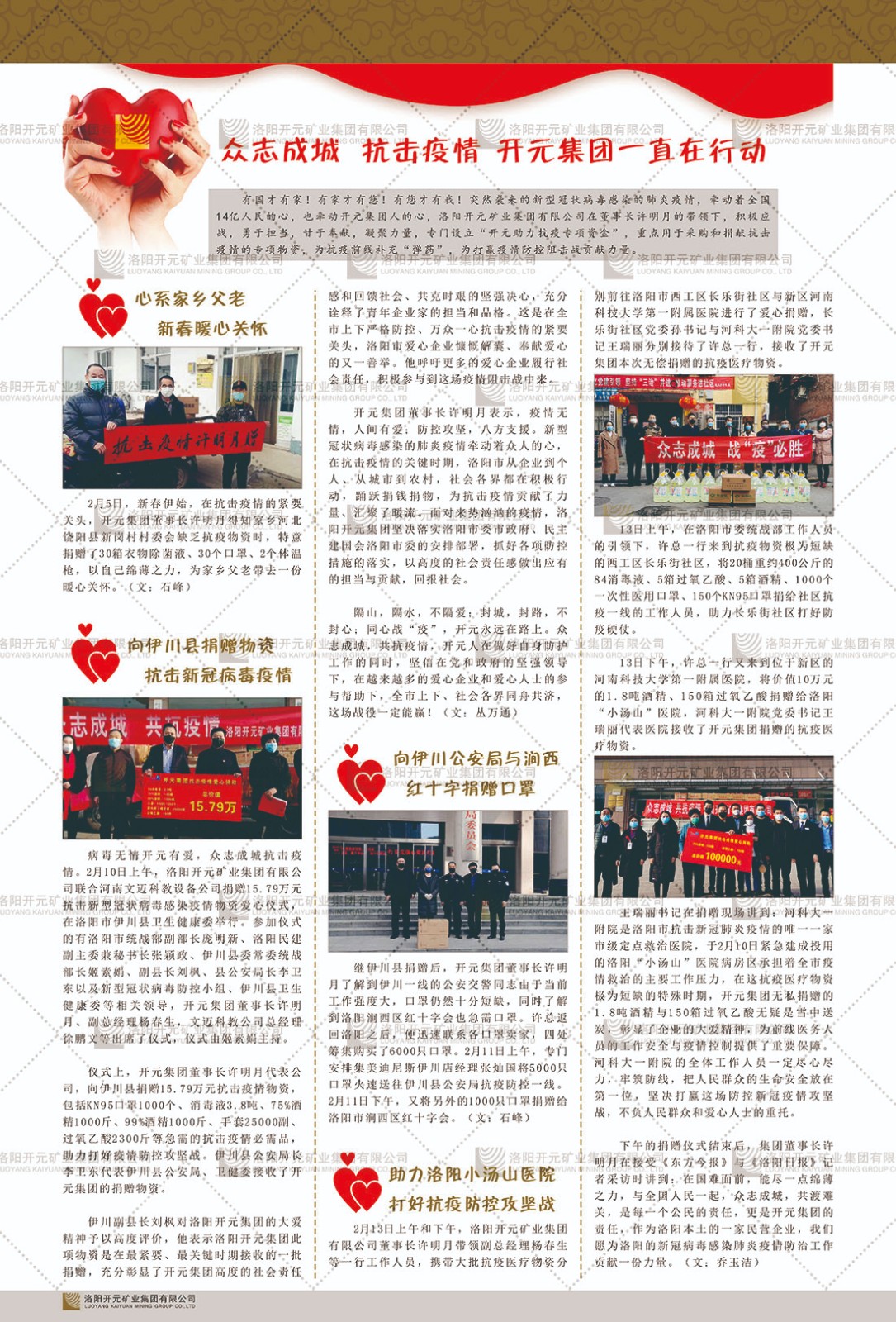 洛陽開元礦業(yè)集團有限公司簡介洛陽開元礦業(yè)集團有限公司,始成立于2006年,位于洛陽市開元大道269號。集團旗下共有十余家全資子公司,業(yè)務涉及有色金屬礦山開發(fā)、礦產(chǎn)品購銷與進出口貿(mào)易、房地產(chǎn)開發(fā)、文化藝術、企業(yè)管理與咨詢、資本投資等多個領域。2024年,集團公司銷售總額達7.8億元。民建河南省委委員、民建河南省委企業(yè)委副主任、民建洛陽市委委員、企業(yè)委主任、洛陽民建企業(yè)家協(xié)會會長許明月是公司創(chuàng)始人,現(xiàn)任洛陽開元礦業(yè)集團有限公司董事長。在礦業(yè)領域,洛陽開元礦業(yè)集團擁有多家實力雄厚的子公司:貴州開元礦業(yè)有限公司探、采礦權面積共11.33平方公里;興海縣銅鑫礦業(yè)有限公司探礦權面積8.76平方公里,礦山資源潛力巨大;2021年,開元集團與盧氏中科礦業(yè)有限公司開展戰(zhàn)略合作。盧氏中科礦業(yè)有限公司專注于有色金屬的浮選、加工和銷售,擁有強大的技術支撐平臺,是集探、采、選、冶、研為一體的中大型綜合礦業(yè)企業(yè)。目前,盧氏中科王家河1000噸選礦廠已成功投產(chǎn),雙河金礦、柳關欒盧鉛鋅礦相繼順利開工,樓房銀礦與圪老灣鉛鋅礦的深部探礦重大突破,標志著礦山版圖取得重大進展,為開元集團后續(xù)發(fā)展奠定了堅實基礎。在文化傳媒領域,洛陽市明月美術館通過豐富多樣的藝術展覽、學術研討和公共教育活動,努力打造一個集展覽、交流、教育、研究為一體的綜合性藝術平臺。此外,在金融投資領域,開元集團旗下的北京明峰資本管理有限公司專注于投資具有高增長潛力的優(yōu)秀企業(yè),特別是高科技、新能源、環(huán)保等新興產(chǎn)業(yè),為客戶提供個性化的資產(chǎn)配置服務。在做好企業(yè)經(jīng)營的同時,開元集團始終不忘企業(yè)的社會責任和家國情懷,以突出的愛心公益事跡,開展了一系列公益慈善活動:“民建林”公益事業(yè)通過“思源基金”“幫幫公益”線上公益平臺,與眾多愛心人士籌措資金20余萬元;資助541名貧困大學生共計270余萬元,推進“數(shù)字助力——河南AI人才培養(yǎng)”;捐款10萬元,馳援京津冀、黑龍江洪水地質災害……公司于2017年底被洛陽市慈善總會評為“洛陽慈善風云榜——十大愛心集體”。洛陽開元礦業(yè)集團有限公司秉承持續(xù)發(fā)展理念,憑借多年來良好的企業(yè)信譽與經(jīng)營業(yè)績,與全國多家企業(yè)建立了良好合作關系,受到社會各界的一致好評,多次榮獲“納稅標兵”“先進企業(yè)”“招商引資模范企業(yè)”等榮譽稱號?;赝麃頃r路,開元人勠力同心,以“闖”的精神和“創(chuàng)”的勁頭,一路披荊斬棘,踏過千山萬水;展望新未來,開元人凝心聚力,不執(zhí)于“舊”,無畏于“新”,秉承“勇于跨越,追求卓越”的企業(yè)精神,乘著國家高質量發(fā)展新征程的東風,跨過高山,越過大海,向著集團多元化、國際化的目標,逐夢遠航,跨越前行!