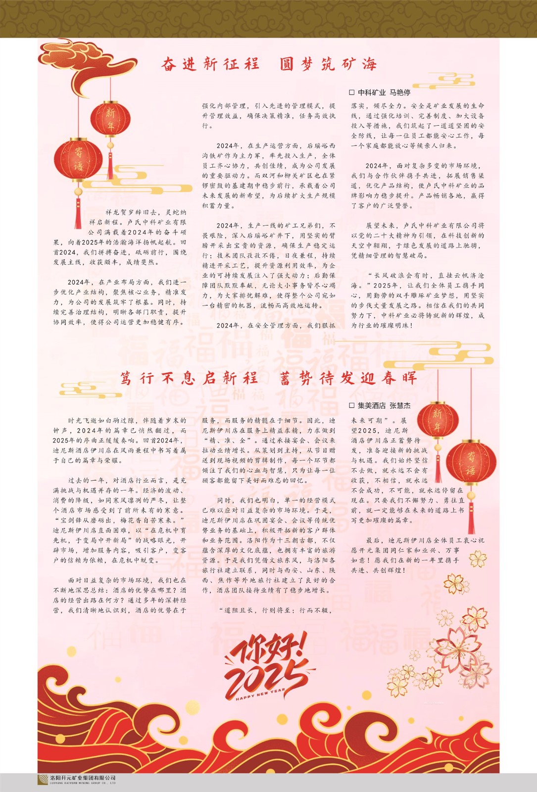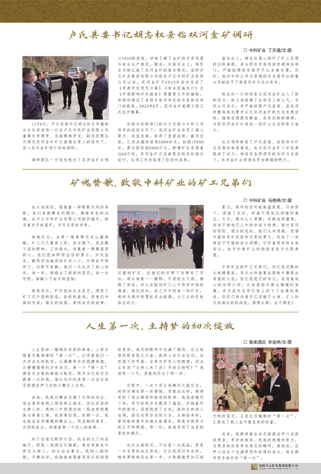 洛陽開元礦業(yè)集團有限公司簡介洛陽開元礦業(yè)集團有限公司,始成立于2006年,位于洛陽市開元大道269號。集團旗下共有十余家全資子公司,業(yè)務涉及有色金屬礦山開發(fā)、礦產品購銷與進出口貿易、房地產開發(fā)、文化藝術、企業(yè)管理與咨詢、資本投資等多個領域。2024年,集團公司銷售總額達7.8億元。民建河南省委委員、民建河南省委企業(yè)委副主任、民建洛陽市委委員、企業(yè)委主任、洛陽民建企業(yè)家協(xié)會會長許明月是公司創(chuàng)始人,現(xiàn)任洛陽開元礦業(yè)集團有限公司董事長。在礦業(yè)領域,洛陽開元礦業(yè)集團擁有多家實力雄厚的子公司:貴州開元礦業(yè)有限公司探、采礦權面積共11.33平方公里;興??h銅鑫礦業(yè)有限公司探礦權面積8.76平方公里,礦山資源潛力巨大;2021年,開元集團與盧氏中科礦業(yè)有限公司開展戰(zhàn)略合作。盧氏中科礦業(yè)有限公司專注于有色金屬的浮選、加工和銷售,擁有強大的技術支撐平臺,是集探、采、選、冶、研為一體的中大型綜合礦業(yè)企業(yè)。目前,盧氏中科王家河1000噸選礦廠已成功投產,雙河金礦、柳關欒盧鉛鋅礦相繼順利開工,樓房銀礦與圪老灣鉛鋅礦的深部探礦重大突破,標志著礦山版圖取得重大進展,為開元集團后續(xù)發(fā)展奠定了堅實基礎。在文化傳媒領域,洛陽市明月美術館通過豐富多樣的藝術展覽、學術研討和公共教育活動,努力打造一個集展覽、交流、教育、研究為一體的綜合性藝術平臺。此外,在金融投資領域,開元集團旗下的北京明峰資本管理有限公司專注于投資具有高增長潛力的優(yōu)秀企業(yè),特別是高科技、新能源、環(huán)保等新興產業(yè),為客戶提供個性化的資產配置服務。在做好企業(yè)經(jīng)營的同時,開元集團始終不忘企業(yè)的社會責任和家國情懷,以突出的愛心公益事跡,開展了一系列公益慈善活動:“民建林”公益事業(yè)通過“思源基金”“幫幫公益”線上公益平臺,與眾多愛心人士籌措資金20余萬元;資助541名貧困大學生共計270余萬元,推進“數(shù)字助力——河南AI人才培養(yǎng)”;捐款10萬元,馳援京津冀、黑龍江洪水地質災害……公司于2017年底被洛陽市慈善總會評為“洛陽慈善風云榜——十大愛心集體”。洛陽開元礦業(yè)集團有限公司秉承持續(xù)發(fā)展理念,憑借多年來良好的企業(yè)信譽與經(jīng)營業(yè)績,與全國多家企業(yè)建立了良好合作關系,受到社會各界的一致好評,多次榮獲“納稅標兵”“先進企業(yè)”“招商引資模范企業(yè)”等榮譽稱號?;赝麃頃r路,開元人勠力同心,以“闖”的精神和“創(chuàng)”的勁頭,一路披荊斬棘,踏過千山萬水;展望新未來,開元人凝心聚力,不執(zhí)于“舊”,無畏于“新”,秉承“勇于跨越,追求卓越”的企業(yè)精神,乘著國家高質量發(fā)展新征程的東風,跨過高山,越過大海,向著集團多元化、國際化的目標,逐夢遠航,跨越前行!